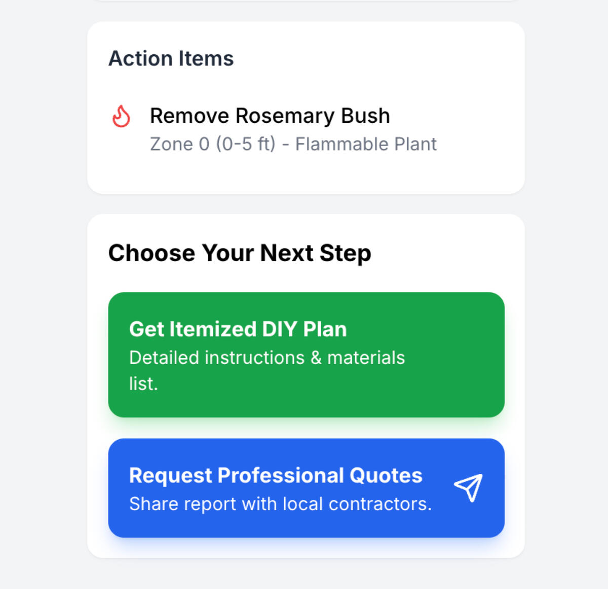 The EmberLens App allows homeowners to easily review their property with a step-by-step process. Get a little dirty and DIY it with our itemized guide, or get an accurate quote from one of our handpicked local companies to get you up to code.