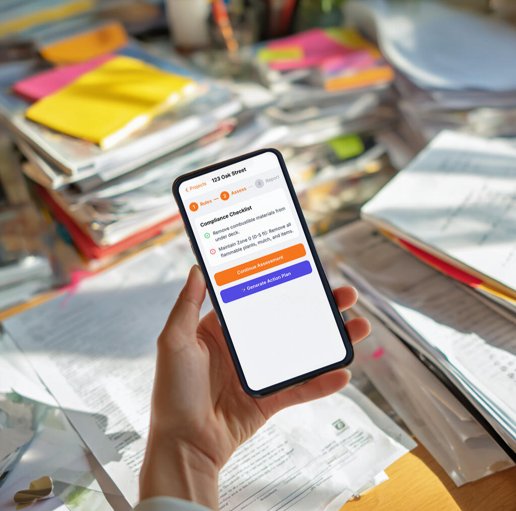 Stop guessing with defensible space and home hardening rules. Our new app guides you through your the process, uses your phone's camera to identify risks, and generates the compliance report.